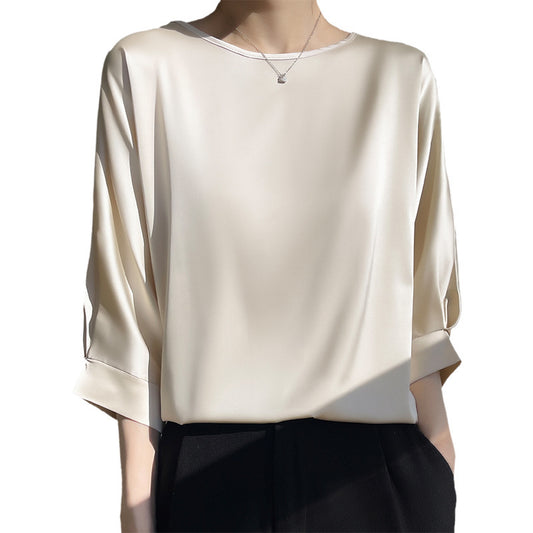 T-shirt court ample en satin de soie glacée à manches courtes et col rond pour femme