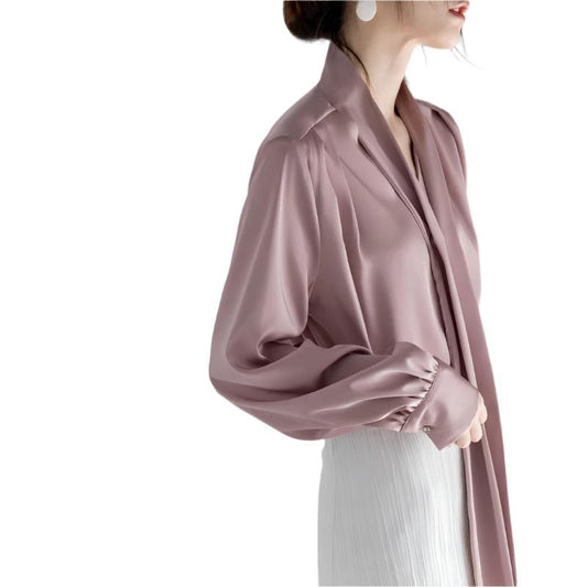 Chemise à manches longues en satin avec col noué Hauts simples et polyvalents