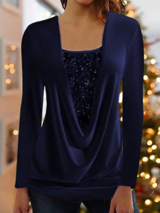T-shirt décontracté élégant à manches longues et col en U avec coutures à paillettes de couleur pure